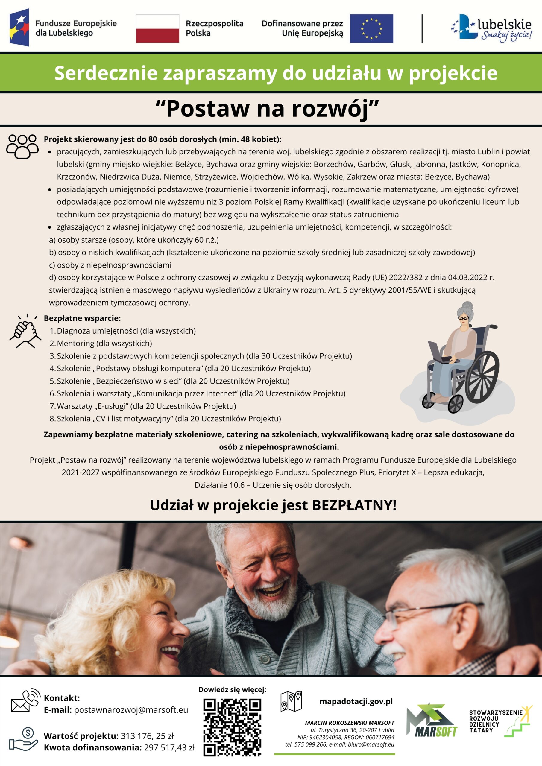 Projekt „Postaw na rozwój” realizowany na terenie województwa lubelskiego w ramach Programu Fundusze Europejskie dla Lubelskiego 2021-2027 współfinansowanego ze środków Europejskiego Funduszu Społecznego Plus, Priorytet X – Lepsza edukacja, Działanie 10.6 – Uczenie się osób dorosłych.